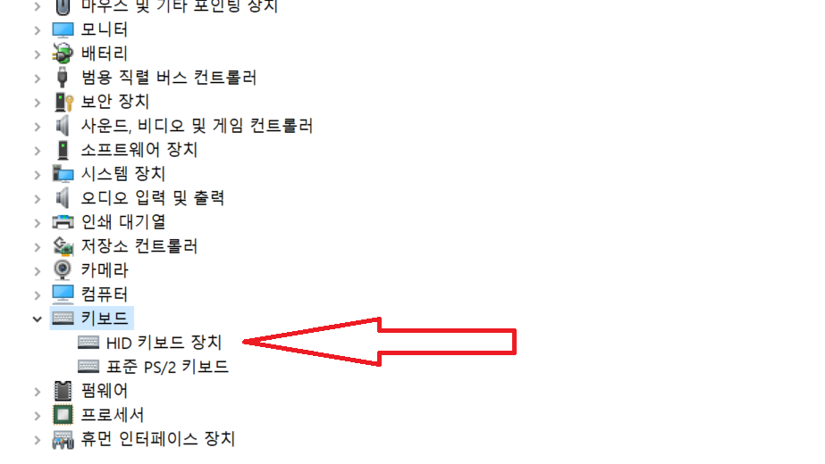 장치 관리자에서 키보드가 정상적으로 인식되는지 확인하는 모습